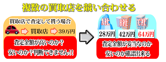 買取店を競い合わせる事が唯一の方法です。どの買取店も安く買いたいのが本音ですが、車を買取しないと利益を出す事が出来ないのが買取店なので、他店に買取されるよりは少しくらい利益を削って(高い査定額)でも買取してきます。